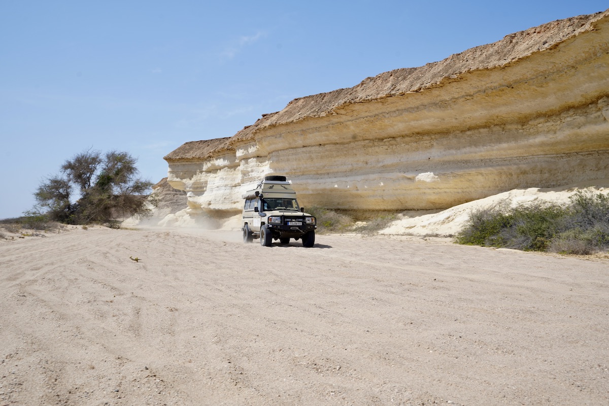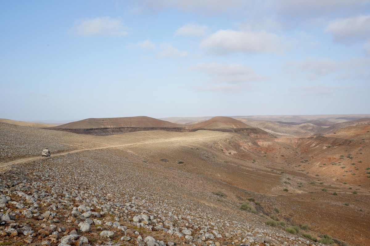 Am überwachten Parkplatz biegen wir auf einen schmalen Offroadpfad ins Hinterland ab – bis im Rückspiegel plötzlich Blaulicht aufblitzt. Vier Polizisten folgen uns auf Motorrädern. Verunsichert bleiben wir stehen und versuchen sie mit einer Charme-Offensive zu korrumpieren. „Please, main road!“, erklärt uns einer der vier in gebrochenem Englisch und zeigt streng Richtung Parkplatz. „Here, dangerous!“, fügt er hinzu. Seinen weiteren Kommunikationsversuchen entnehmen wir, dass an diesem Ort wiederholt Touristen überfallen wurden und die Felskante als praktische Entsorgungsstelle für ungeliebte Mitmenschen genutzt wird. Mehr müssen wir nicht wissen. Wir verteilen Geschenke und notieren die Telefonnummer des englisch sprechenden Polizisten. Man weiß ja nie.