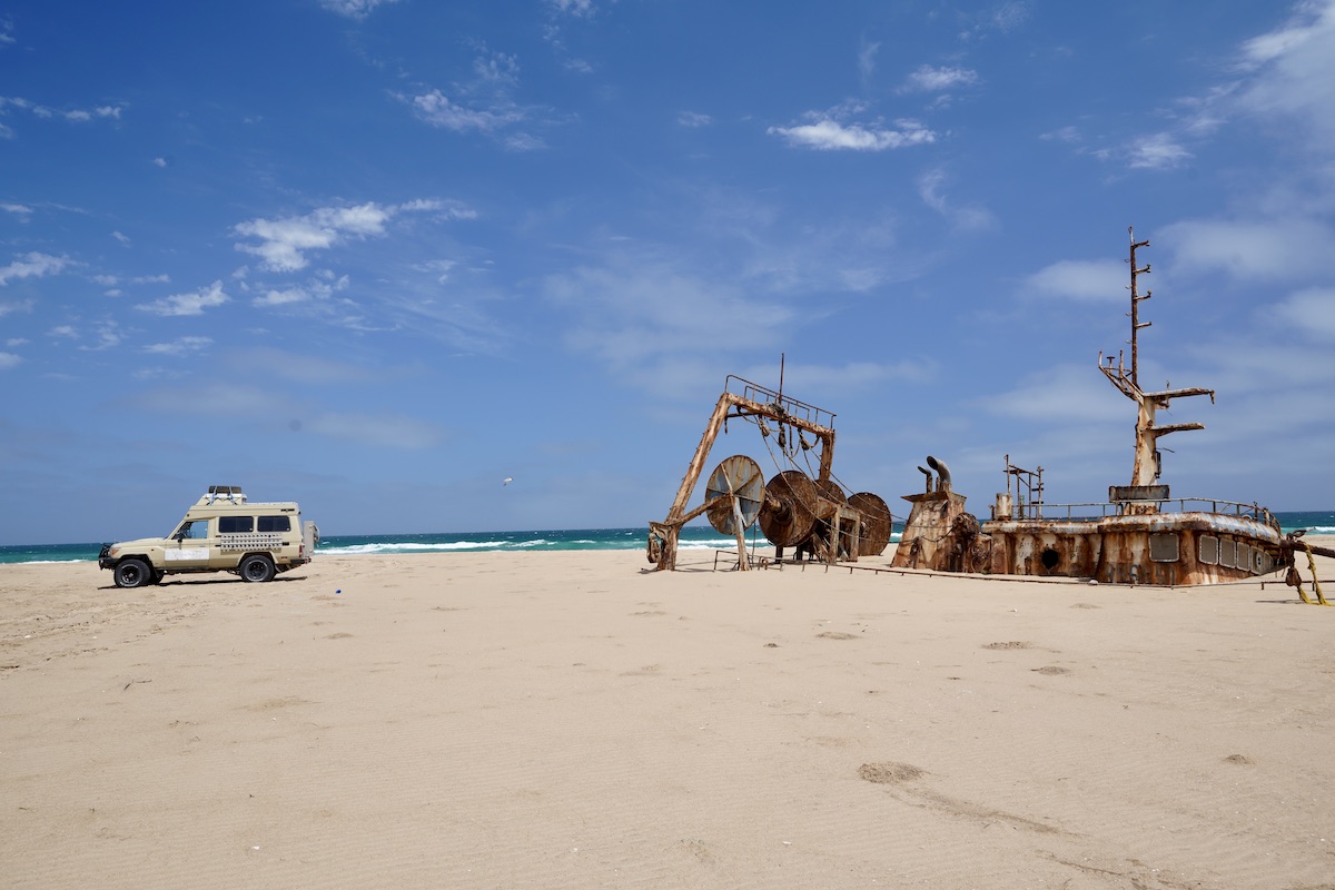 Von der Hochebene fahren wir über die steilen Serpentinen der malerischen Serra da Leba-Passstraße zwischen üppigen Mangobäumen in die Küstenstadt Namibe. Die Vegetation verliert sich zunehmend im Sand, bis zuletzt nur noch gelegentlich die welken Blätter der jahrhundertealten Welwitschien-Wüstenpflanzen aus Sand und Schotter ragen. Das Stadtbild von Namibe ist – wie die meisten Städte Angolas – geprägt von portugiesischer Architektur. Doch die Gebäude sind marode und vernachlässigt und vor der Stadt türmen sich stinkende Müllhalden. Wir flüchten weiter in den Süden und gelangen im Iona Nationalpark über eine riesige, mit einer dicken Schicht winziger Muscheln übersäten Salzpfanne, direkt ans Meer. Der Atlantik brandet wild an den kilometerlangen Sandstrand und unser Blick verliert sich im grenzenlosen Nichts. Einziges Mahnmal menschlichen Lebens ist ein rostiges Schiffswrack, das sich bereits halb versunken seinem Schicksal ergeben hat. Der Sand ist hinterlistig weich und lässt unser Auto so tief einsinken, dass wir umgehend wenden. Mit einem erfahrenen Guide, Begleitfahrzeugen und bei passender Gezeit hätten wir auf dem schmalen Streifen zwischen den sich immer steiler auftürmenden Dünen der Namib und dem rauen Ozean Richtung Namibia fahren können. Der Abschnitt wird allerdings nicht ohne Grund ‚Death Acre‘ genannt: Fährt man zur falschen Zeit, verschluckt das Wasser den Strand – und mit ihm die Fahrzeuge leichtsinniger Offroader.